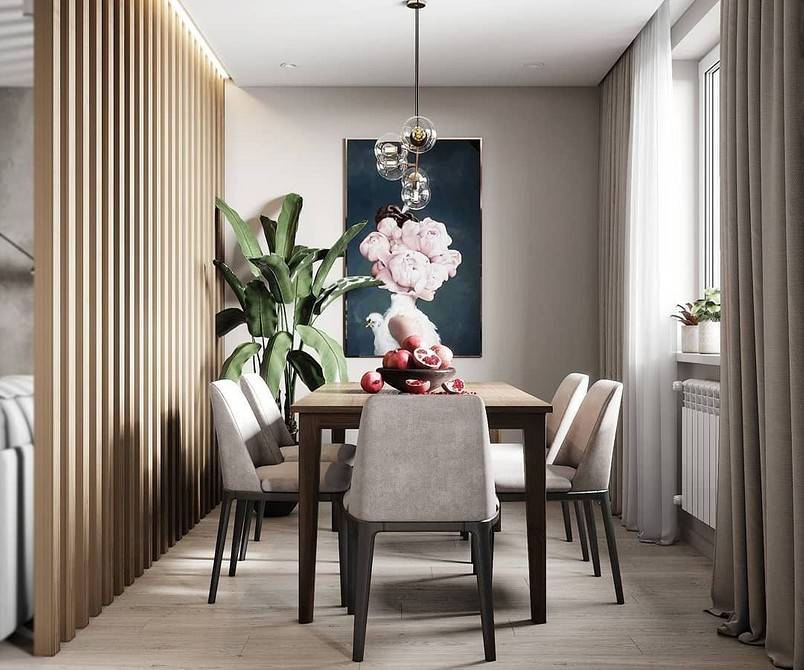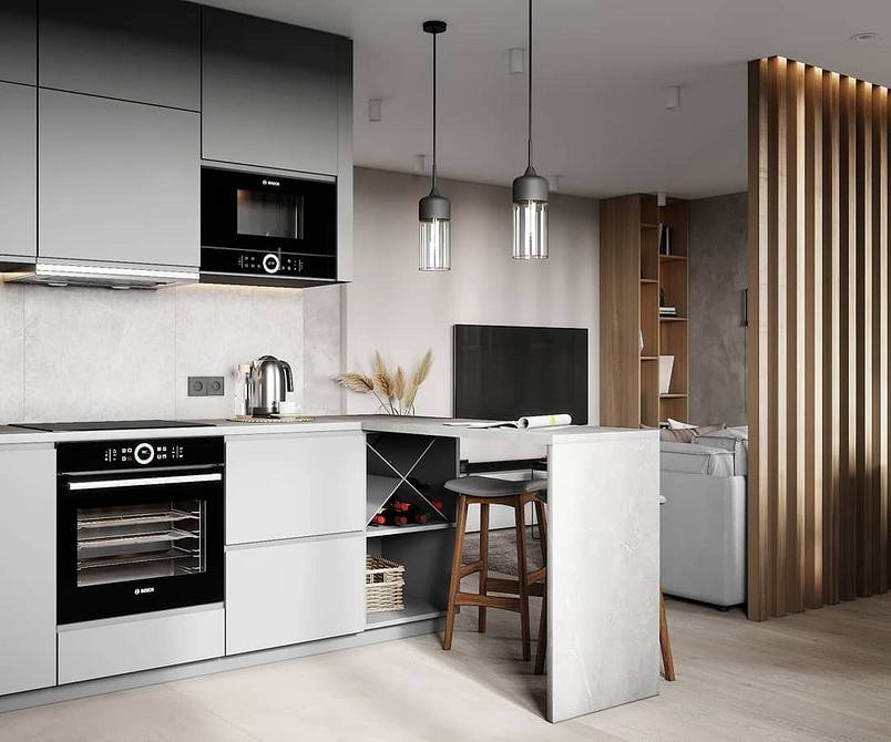 Второй — для зонирования. Если кухня большая, и вам хочется отделить столовую от рабочей зоны, но при этом сохранить легкость и воздушность, этот приём — для вас. Главное достоинство баффелей — они не блокируют естественное освещение и не перегружают помещение в отличие от простенка из гипсокартона.