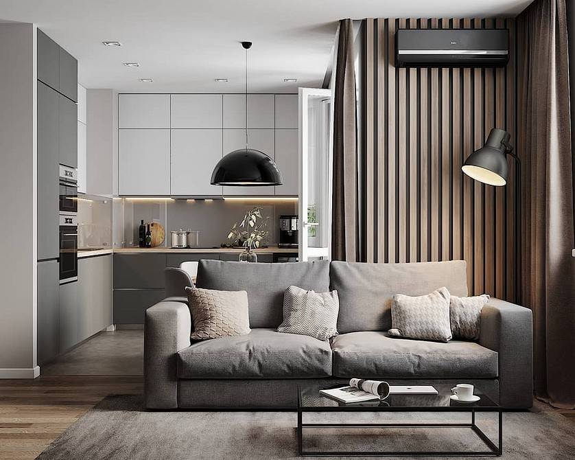 По аналогии с зонированием рабочей зоны и столовой, с помощью подобного простенка можно отделить кухню от гостиной. Речь идёт о совмещенном помещении. Здесь особенных секретов нет, простенок располагают обычно между диваном и барной стойкой или гарнитуром. Ещё таким же образом можно разделить саму гостиную на зоны, например, выделить рабочее пространство или игровое для детей.