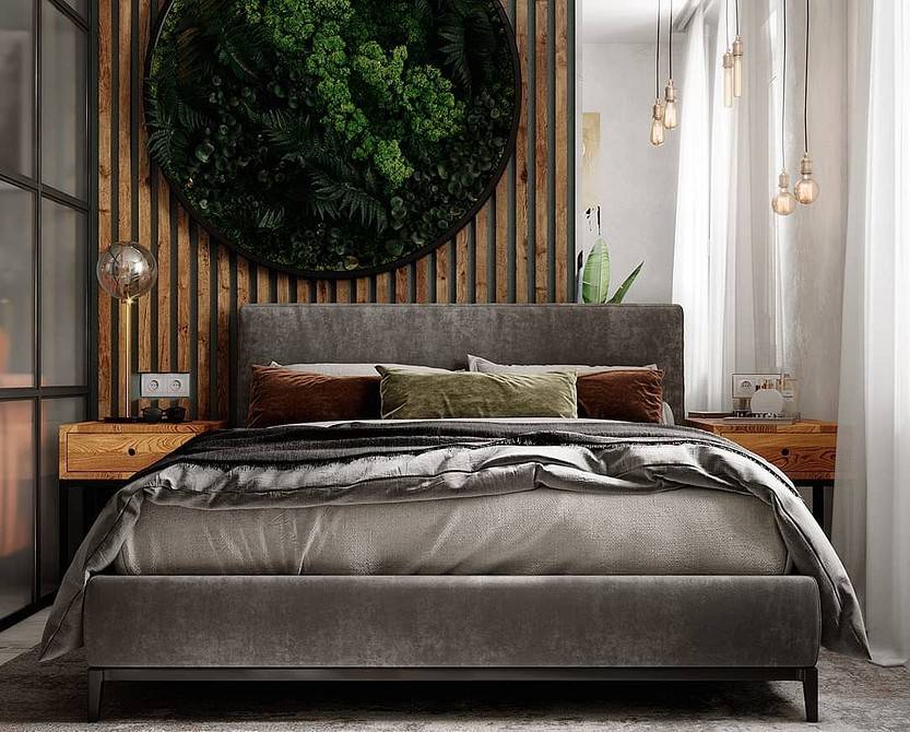 На фото простой матрац на поддонах и изголовье из спилов смотрится необычно в современной квартире. Такая простота сочетается с экологичностью и стилем одновременно.