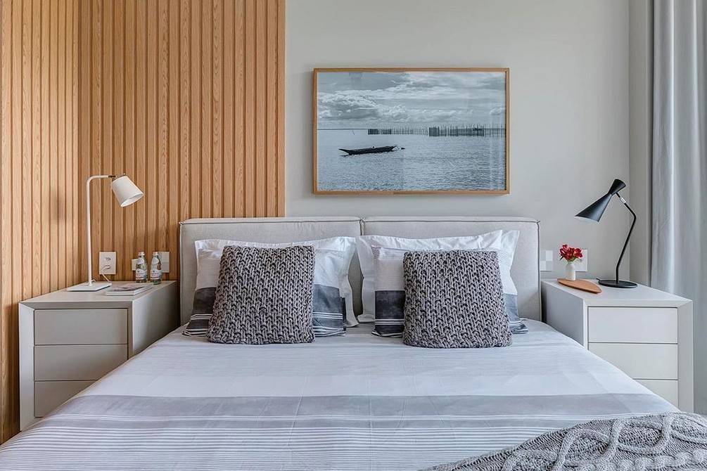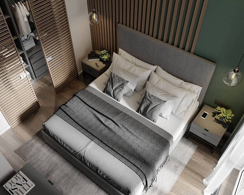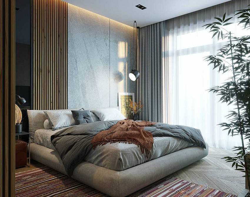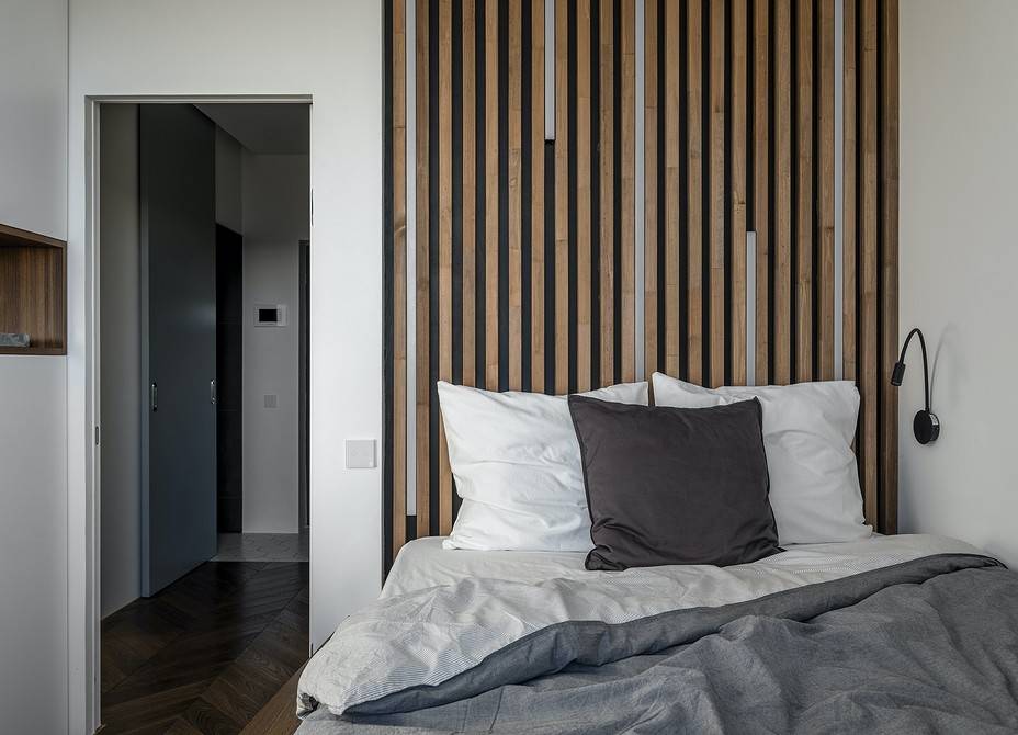 В интерьере спальни деревянные рейки обычно располагают на фокусной стене — у изголовья кровати. Натуральные фактуры — один из самых ярких трендов в оформлении этой комнаты.