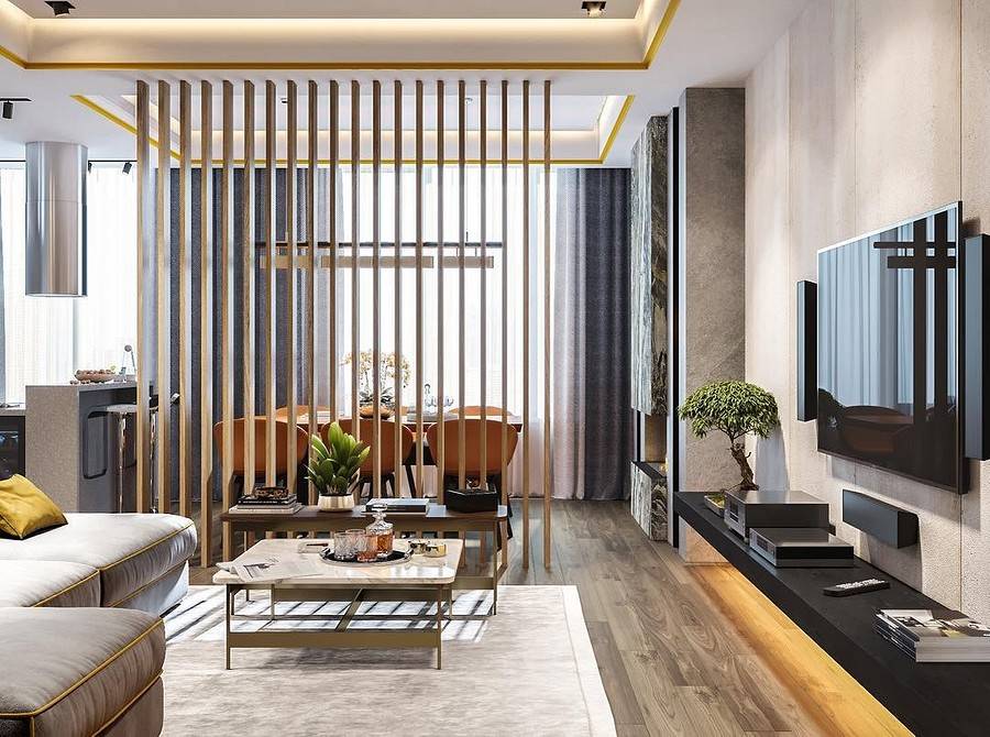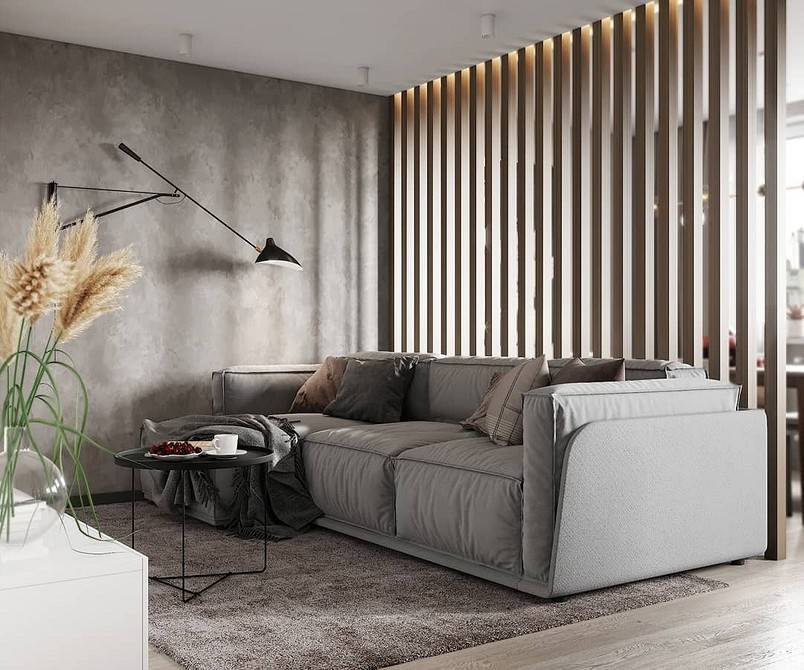 В декоре гостиной использование баффелей — тренд последних лет, хотя некоторые дизайнеры называют его уходящим. Они смотрятся геометричнее, чем те же панели из дерева или МДФ.