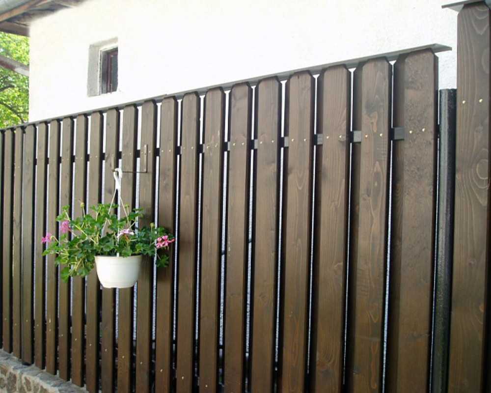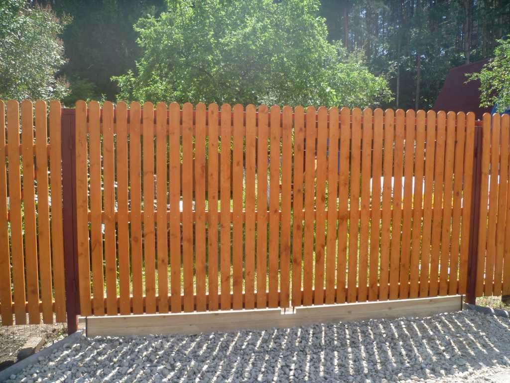 - Обычный либо фигурный штакетник, собираемый из планок на двух поперечинах, прикрепленных к стойкам.