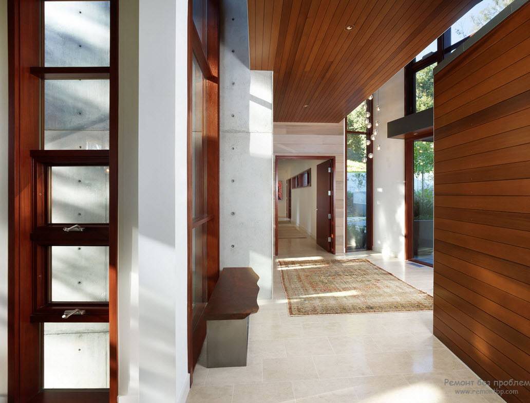 Натуральная древесина сочетается с современными элементами: металлическими или стеклянными панелями и вставками.