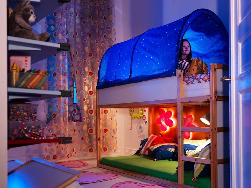 - Шторку, стульчик и другие приспособления для игр. Шторка пригодится для создания ощущения уединенности и уюта. Остальное вещи будут меняться вместе с изменениями вкуса ребенка и его взрослением. В 3 года стоит просто положить на пол несколько любимых игрушек ребенка или установить под кроватью игрушечный замок;