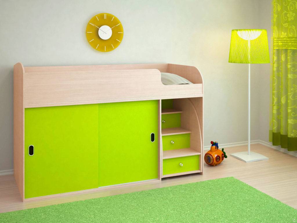 Низкая кровать чердак предназначена для дошкольников в возрасте от 2 до 5 лет. Особенностью конструкции является низкое спальное место. Высота койки не должна превышать 100 см от пола. На нижнем ярусе можно разместить письменный столик, различные системы для хранения игрушек и небольшие игровые зоны. Конструкция выглядит компактно за счет использования выдвижных компонентов и отказа от надстроек.