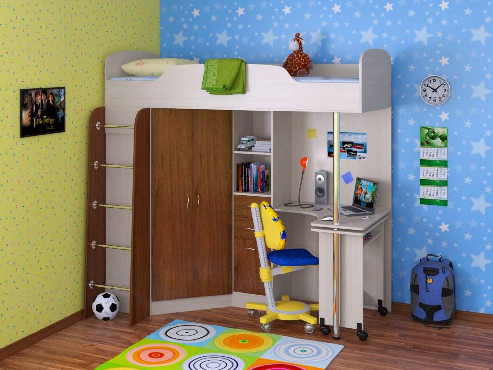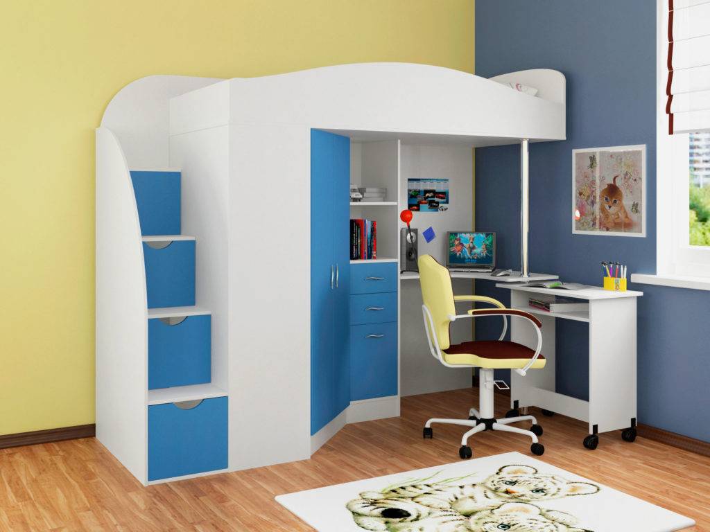 Кровать-чердак комбинируют с разными предметами мебели: рабочий стол, второе спальное место, стеллажи для книг и игрушек, шкафы или комод для одежды, спортивный комплекс.