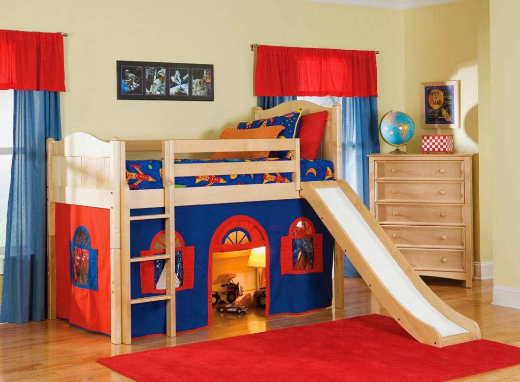 Кровать с зоной для игр для мальчишек часто имитирует внешний вид салона автомобиля, космического корабля, палатки в лесу или рыцарского замка. Этот потрясающий аттракцион подходит для увлекательных игр с друзьями.