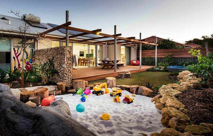 - Дети 3-5 лет. В этом возрасте все малыши собственники и индивидуалисты. Для них интересны яркие пружинные качалки различных форматов, лабиринты, качалки-балансиры. Можно построить домик со столиком и стульчиком и укомплектовать его горкой для детской площадки. Для совсем маленьких соорудите шалаш из старых покрывал. Песочница считается самым популярным элементом игровой зоны: дети с удовольствием лепят фигурки в ней до 7 лет. Также обязательным развлекательным атрибутом являются качели. Для младшего возраста их делают невысокими, с небольшой амплитудой раскачивания. Когда ребенку исполнится 5 лет, добавьте элементы, развивающие интеллект — доску для рисования, различные считалки. Купить их можно в интернете, но даже при наличии небольшого опыта их легко сделать своими руками.