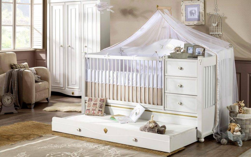 - В малогабаритных квартирах хорошо подойдет традиционная детская кроватка — на ней можно собрать планальный столик (покупать отдельный комод не нужно ), у большинства моделей также есть нижний ящик, в который поместится много вещей.
