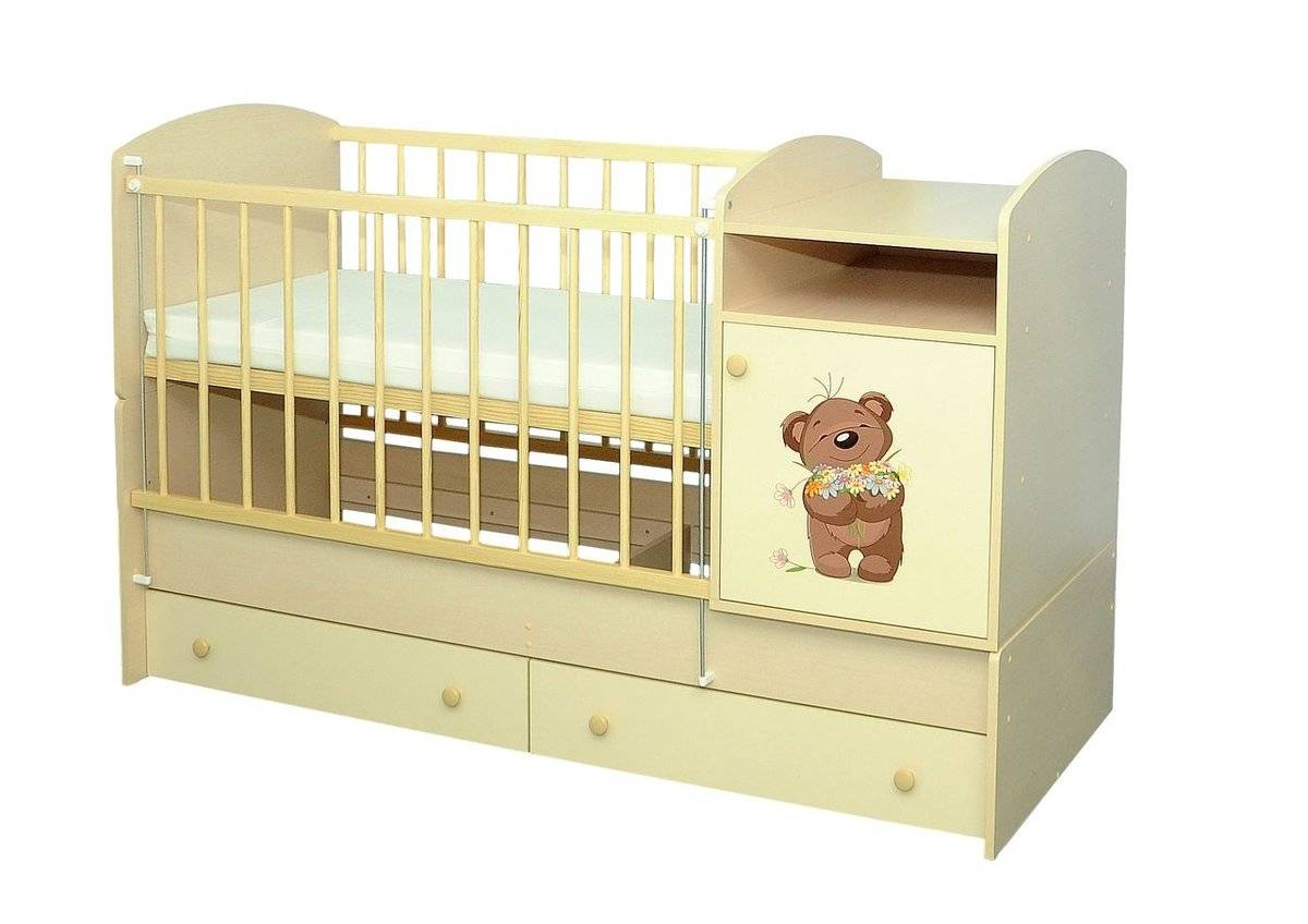 Это – своего рода интерпретация классической модели, которая оснащается дополнительными пристройками. Присоединенный к спальному месту комод – такой вариант, который подойдет и для младенцев и для малышей чуть старше. Часть с комодом – удобное дополнение, позволяющее держать в порядке вещи малыша.