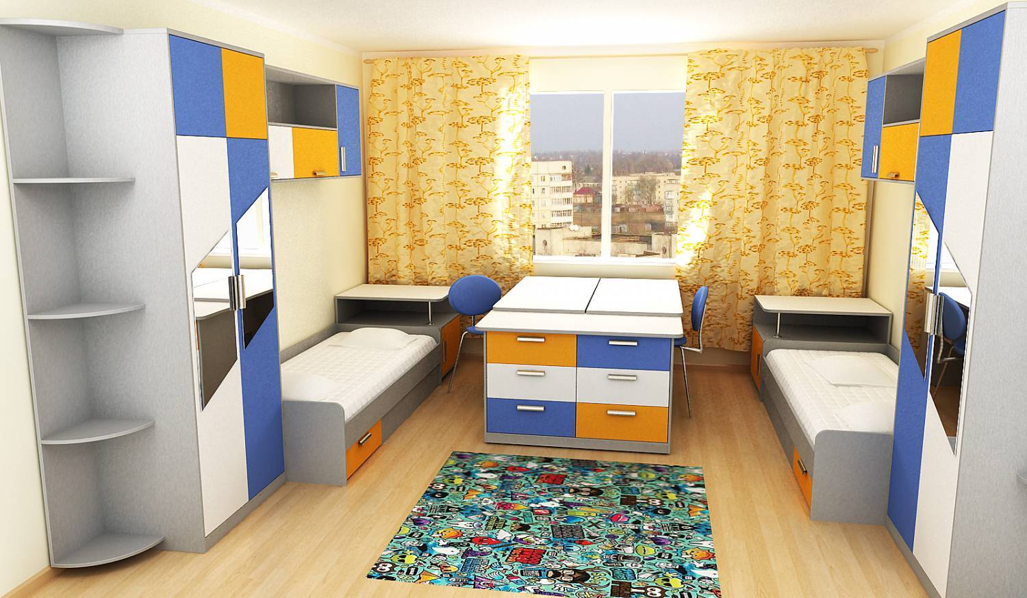 Если у вас двое детей, необходимо покупать более крупную по размерам и более вместительную мебель. Это может быть соединенная стенка с двумя столами или любые двусторонние модели. Очень многие используют последний вариант для зонирования детской комнаты для двоих детей. Есть даже модели с широкими шкафами, которые имеют сдвоенную конструкцию. Их двери открываются с обеих сторон по бокам.
