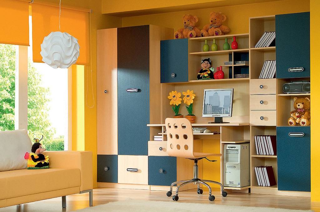 Это могут быть розовые, жёлтые, персиковые, бежевые стенки для девочек и голубые, зелёные, синие модели для мальчиков. Такие комплекты мебели могут иметь интересный декор.