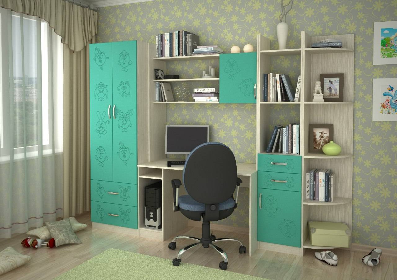 - Легкий вариант в цвете светлой древесины и мяты сочетает в себе классический платяной шкаф и шкаф-пенал. Удобный компьютерный стол и верхние полки позволяют эффективно организовать рабочее пространство школьника.