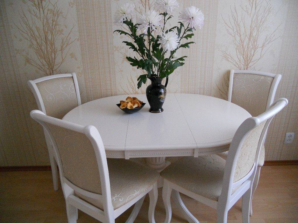 Белый цвет часто становится предметов выбора хозяек, которые хотят сделать интерьер кухни более изысканным и элегантным. Такое изделие добавляет в интерьер нотки свежести и визуально увеличивает пространство. Обеденная зона в белых тонах будет отлично сочетаться как со светлым, так и с темным гарнитуром.Зрительно улучшает и благоприятно воздействует на пространственное восприятие, наполняя его простором, свежестью и светом.
