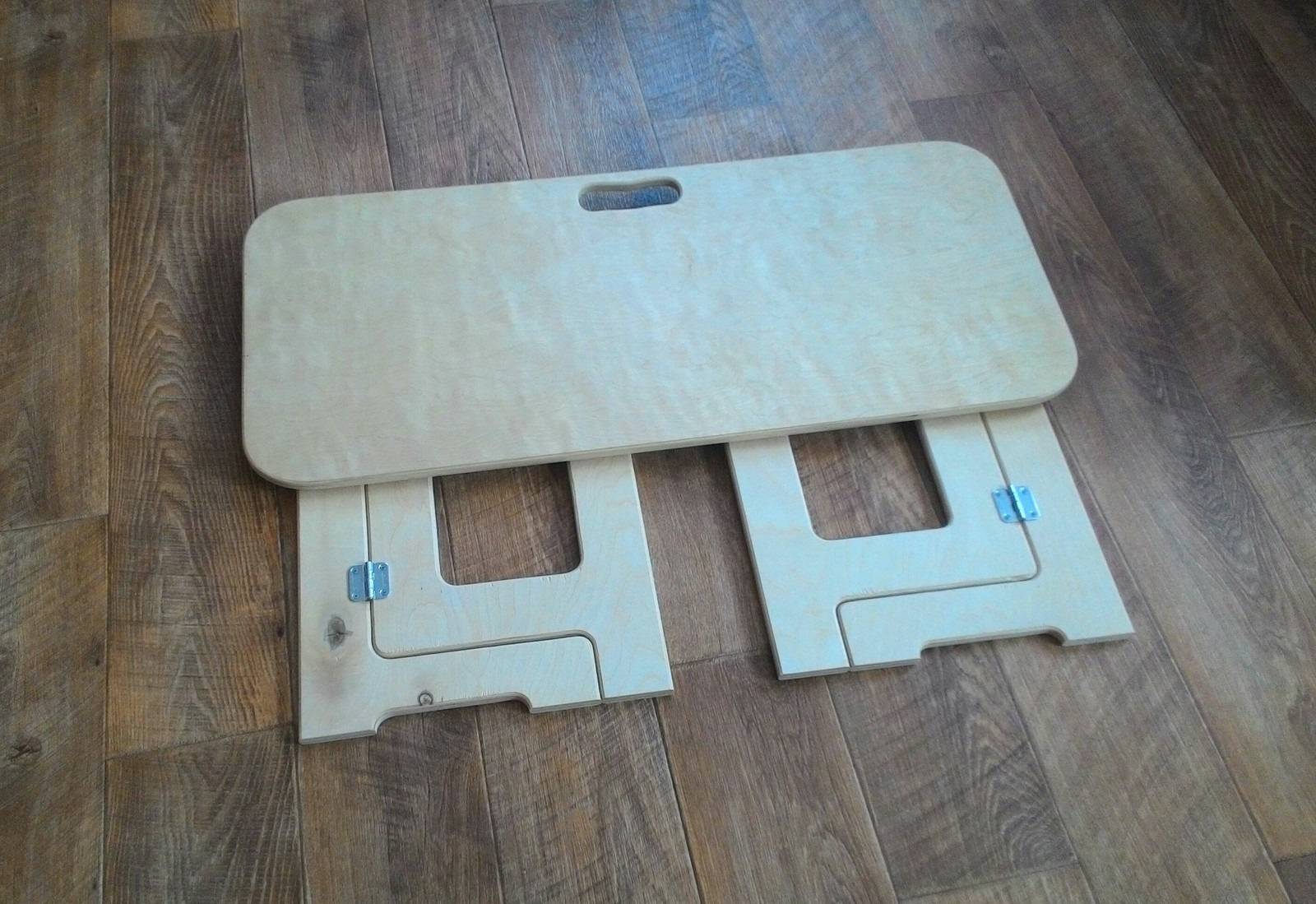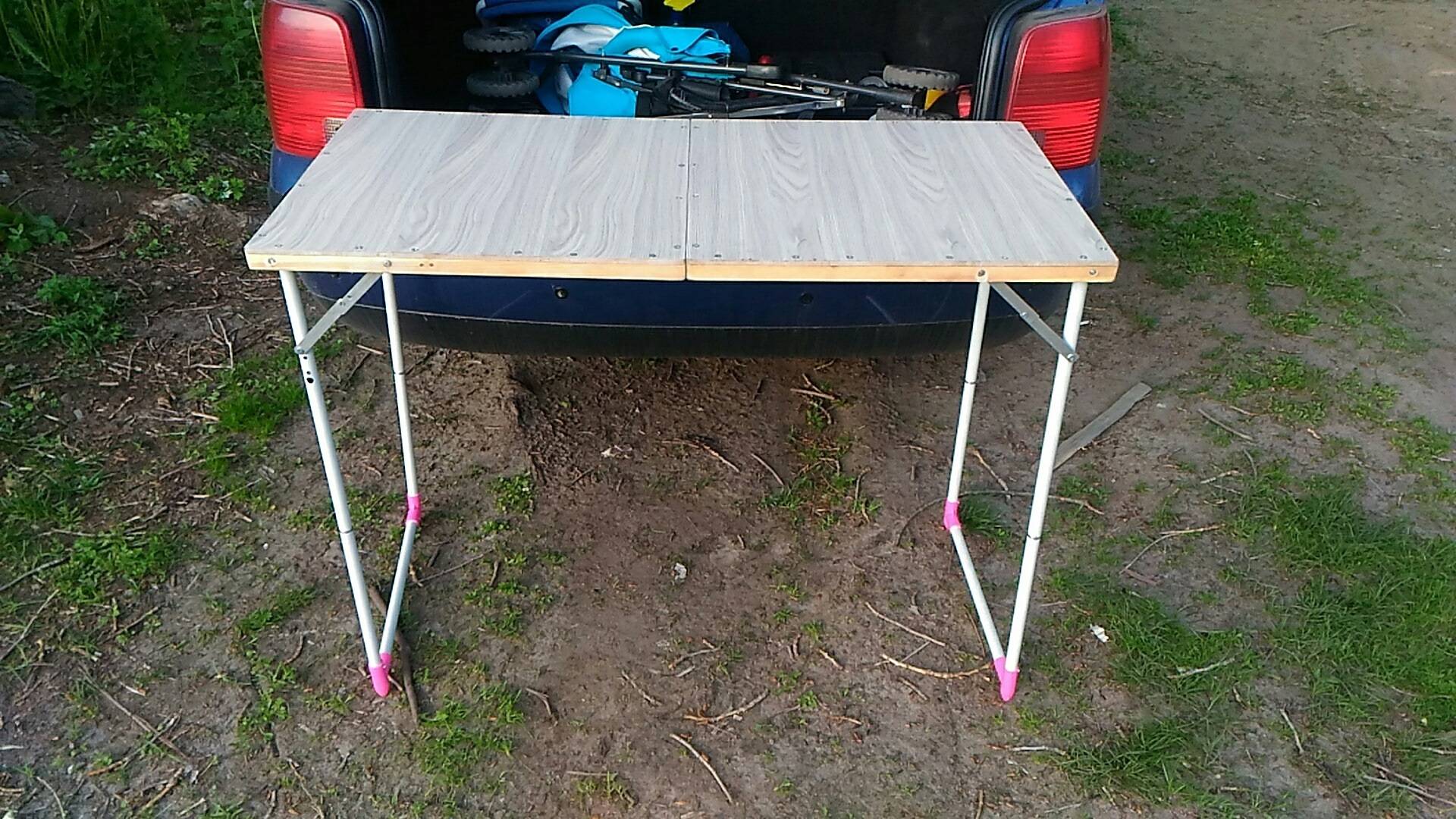 Самый популярный вид складных столов – деревянный. Если хотите сделать его максимально легким и простым в транспортировке, то установите недорогую столешницу из ДСП.