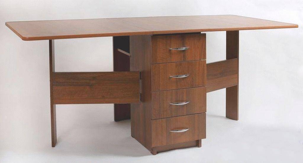Достаточно раскрыть полотно, чтобы увеличить площадь столешницы, и можно пользоваться. По размерам старые модели имели ширину 85 см, длину от 170 см (разложенный вид). Собранный вариант характеризовался минимальными параметрами – 30 х 85 см. Соответственно, длина разложенного наполовину стола составляла около 100 см.