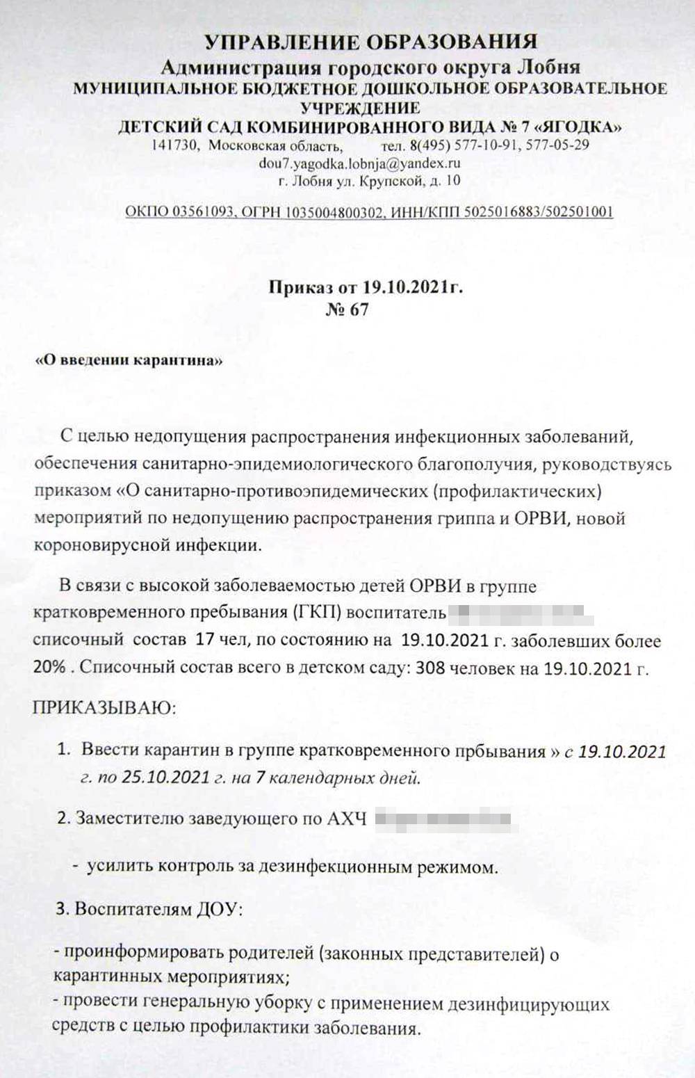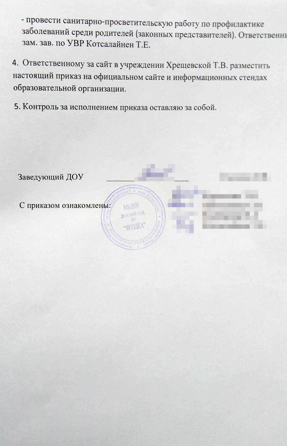 С содержанием приказа (постановления) под личную подпись знакомят персонал и родителей всех детей, посещающих детский сад или группу, в которой вводится карантин.
