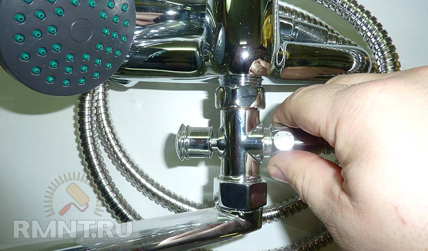 Также такой дивертор может быть поворотный. Он отличается простой конструкцией. Чтобы изменить направление потока, достаточно повернуть ручку. Механизм устанавливается, когда смеситель оборудован двумя ручками.