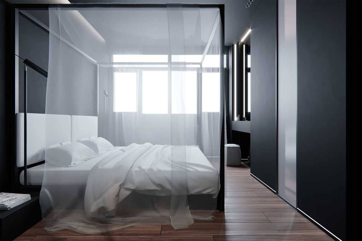 Не стоит забывать, что ткани, которых может быть так много в спальне, тоже участвуют в формировании цветового восприятия. Перед нами спальня, в которой стены и потолок чёрные, а белый добавлен в виде тонкой вуали, накрывающей балдахин кровати, и пастельного белья.
