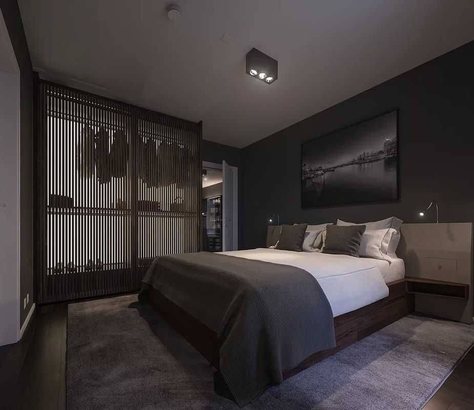 Именно в тёмной обстановке легче сконцентрировать внимание на ярких акцентах. На примере чёрная спальня с оригинальным панно на стене за кроватью