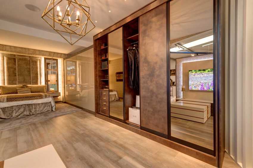 - Арт-деко. Этот стиль включает в себя крупные детали интерьера и аксессуары (массивная кровать и прикроватные тумбы, большой туалетный столик и соответствующее по размеру зеркало). Здесь уместны глянцевые поверхности, тяжелые светильники под бронзу.
