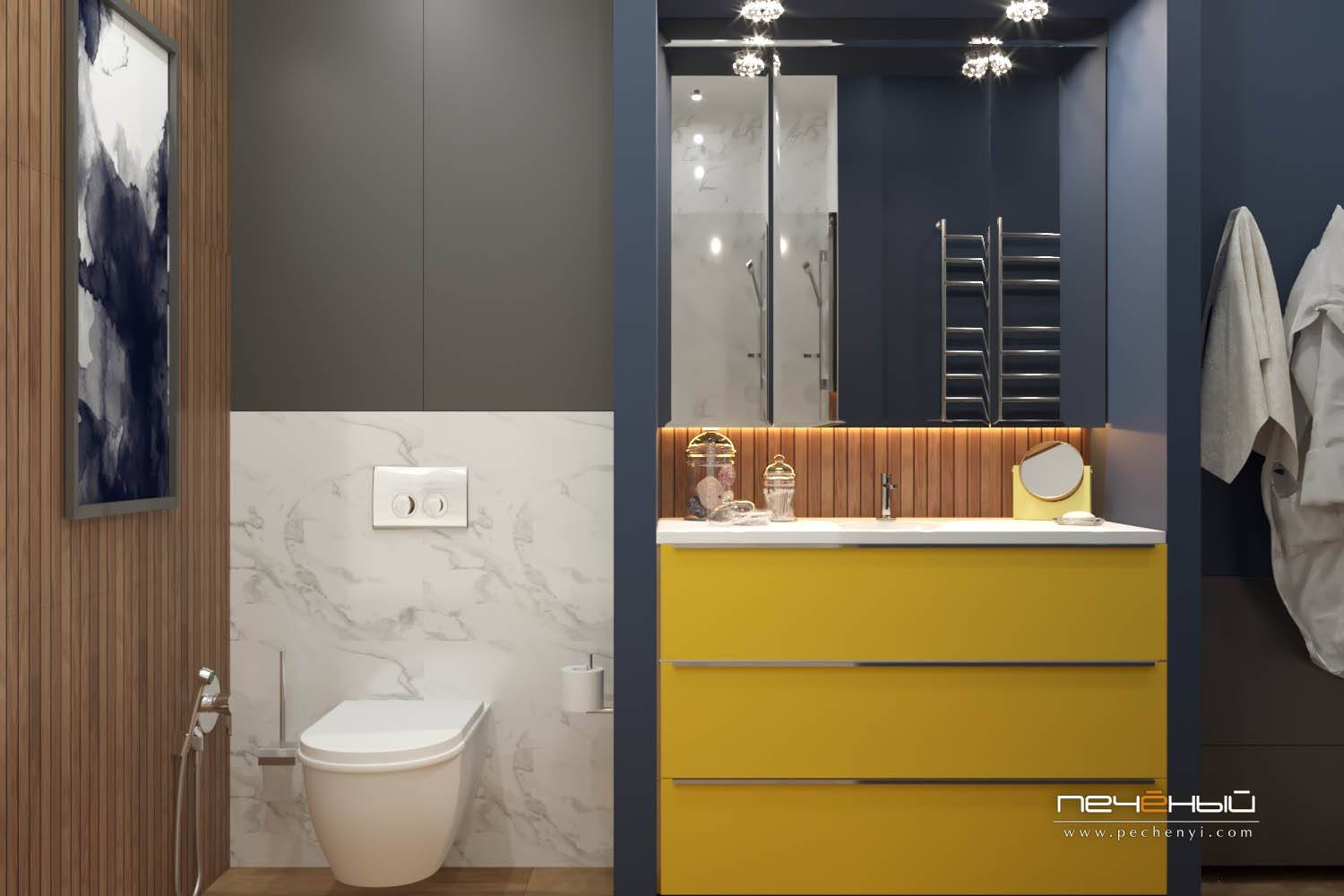 Красивый дизайн квартиры – это не только оригинальный декор. Это ещё и умение извлечь пользу из совершенно невыгодных условий. Так, этот санузел, странной вытянутой формы, превратился в эргономичное и удобное помещение для всей семьи.
