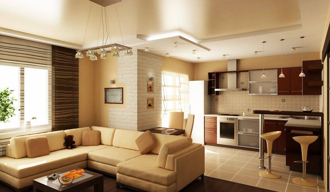 Совмещение «гостиная-кухня» – в одном пространстве умещается зона готовки, отдыха, а по центру обычно располагается обеденная зона. В свободном углу можно ненавязчиво расположить личный кабинет;