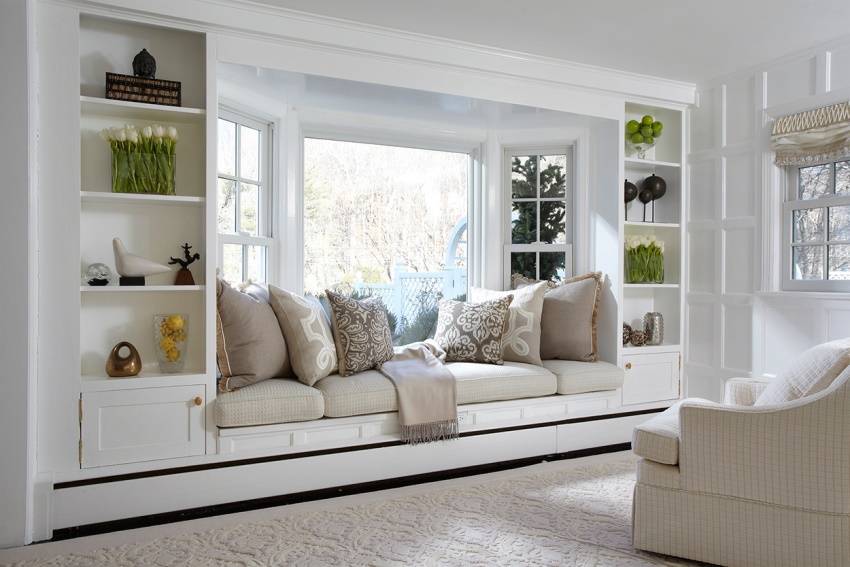 - в полукруглой нише с окнами можно поставить широкий подоконник и оснастить его большим количеством мягких подушек, при установке мягкого освещения, мы получаем идеальное место для чтения, при котором можно любоваться пейзажем за окном или просто проводить время с чашкой чая.