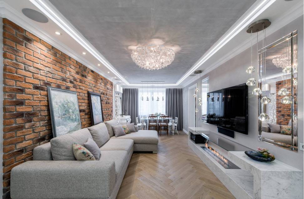 Еще больше выделить и акцентировать внимание на не сквозном проеме с тв-панелью получается за счет имитации кирпичной кладки.