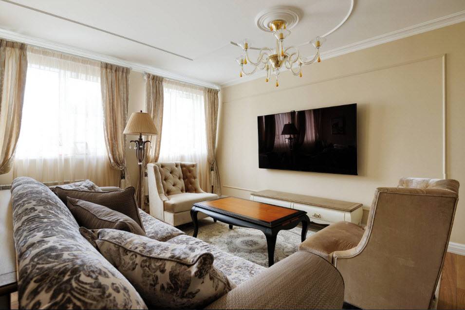 В классическом дизайне, телевизор не должен бросаться в глаза, поэтому для его украшения нужен особый декор, например экран можно спрятать в шкафу или скрыть за ширмой. Также для гармоничного сочетания, современную технику оформляют с помощью багетных и деревянных рам под старину, молдингов, лепнины с патиной или размещают тв-панель на стене между колоннами или в нише.