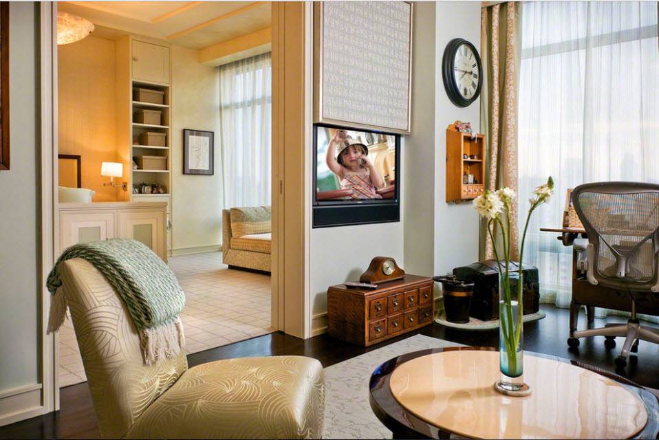 При продуманном подходе и грамотном комбинировании тв-модели с другими интерьерными предметами зала, получается органично вписать данное устройство практически в любое стилевое направление.