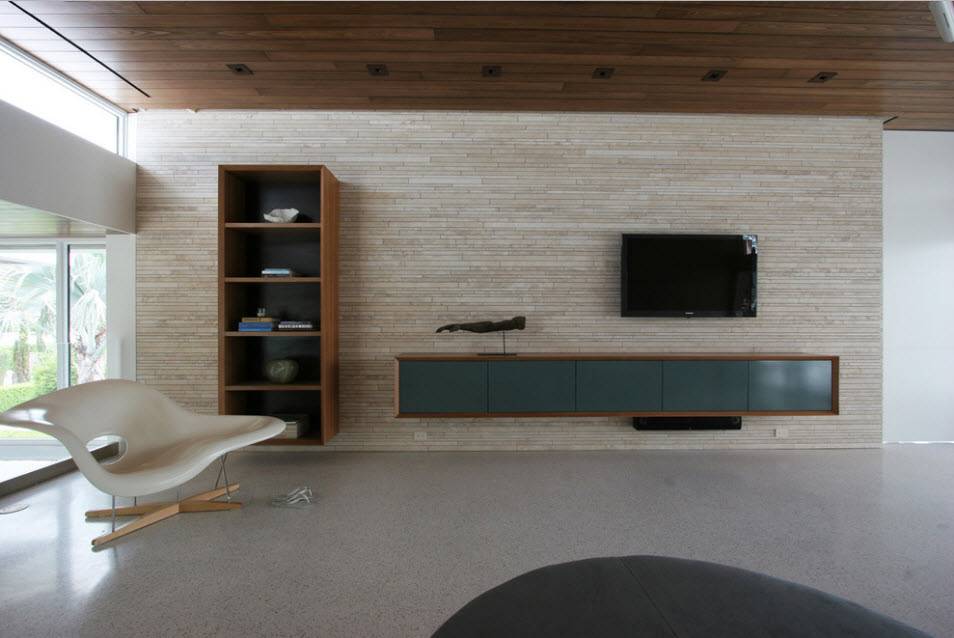 В современных домах особенно приветствуется деревянный элемент, поскольку он имеет тенденцию смягчать холодную и стерильную эстетику. Дерево выглядит красиво практически в любом варианте. Это может быть панель с телевизором или угловой шкаф. Область хранения возле ТВ может быть также разработана для DVD-дисков, видеоигр и оборудования. Удачным сочетанием будет совмещение твердых пород дерева с хромированной рамой и светодиодным освещением сверху и снизу.