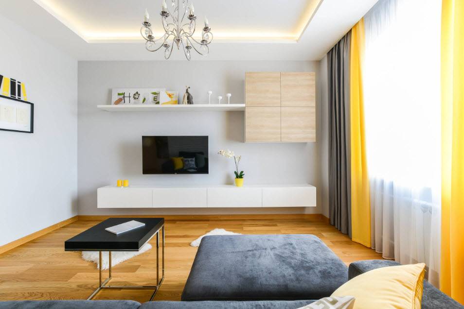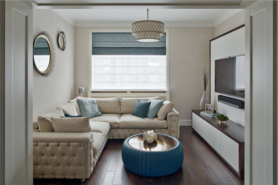 - В узком или длинном зале нужно особенно внимательно подойти к выбору диагонали тв-устройства, так как если экран будет слишком большого размера, то при просмотре с такого близкого расстояния, может возникнуть дискомфорт для глаз. Поэтому, в такой гостиной рекомендуют располагать тв-модель на стене напротив окна, при этом используя плотные шторы или жалюзи.