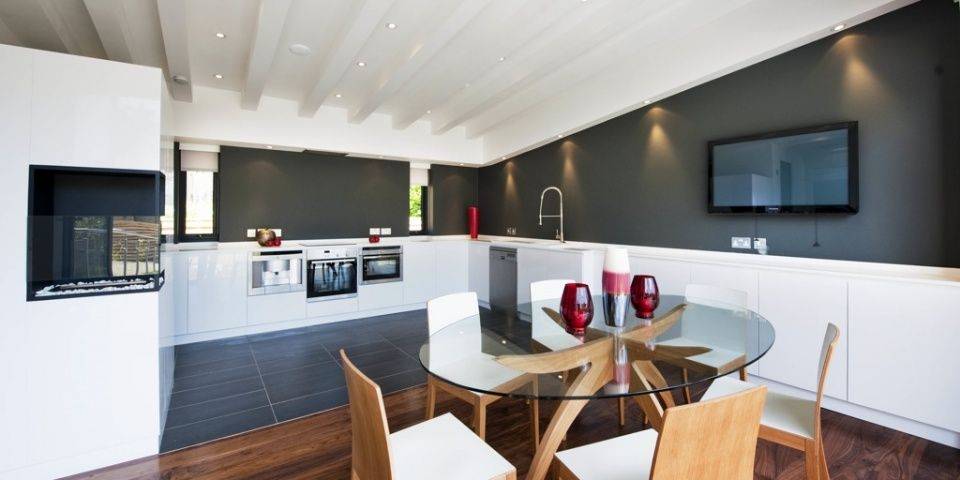 Кухонное пространство или столовая в первую очередь предполагает компактные и функциональные углубления с отделкой в виде панелей ламината.