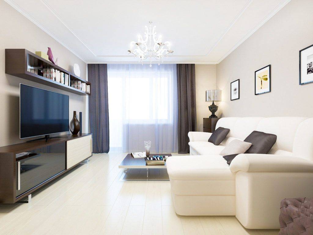 Переходы в соседние комнаты обычно сквозные или через угол – двери расположены близко на смежных стенах. Во втором случае удобнее обустраивать комнату роскошной мебелью. Удобнее планировать функциональное зонирование зала. Здесь найдется, где разместить встроенный шкаф-купе, если без него в семье не обойтись. Торцевую стену гостиной с широким окном можно красиво задрапировать многослойными шторами.