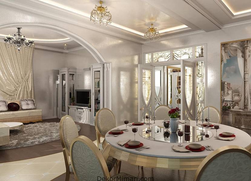 Традиционно размещение зон идет в таком порядке: кухня, затем столовая и гостиная. Если форма помещения трапециевидная, то допустимо расположить столовую и гостиную параллельно рабочей зоне. Переходные участки оформляют арками, колоннами или порталами. В классическом интерьере категорически не рекомендуют обеденную зону делать в одном помещении с рабочей.