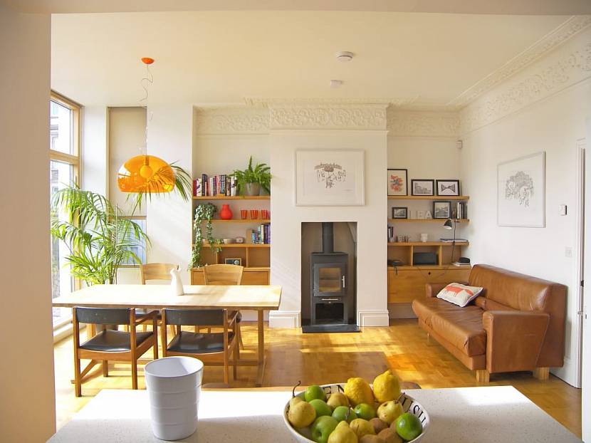 Чтобы кулинарные запахи не въедались в шторы и мебельную обивку в гостиной, установите очень мощную вытяжку. Не забывайте, что ее производительность должна быть рассчитана с учетом площади не только кухни, но и зала. Чтобы рассчитать оптимальную производительность вытяжки воспользуйтесь формулой: