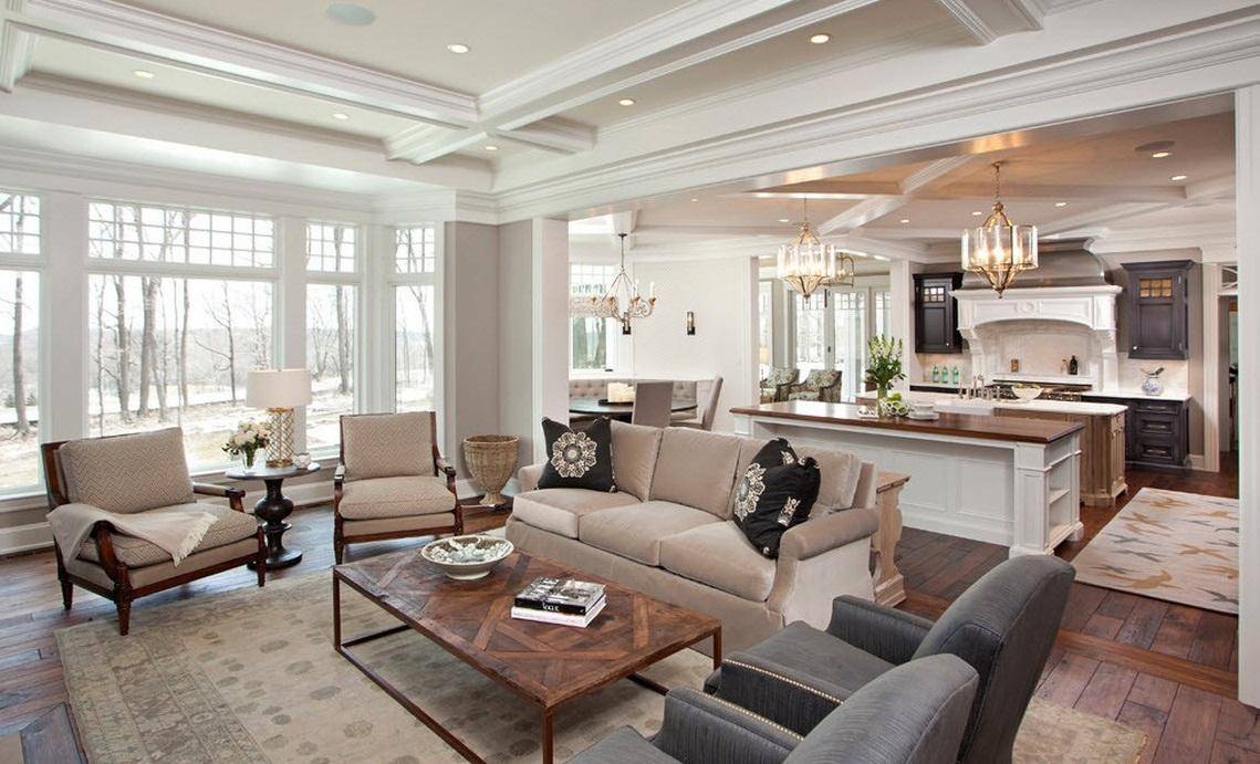 В помещениях с большой площадью без зонирования просто невозможно обойтись. Интерьер гостиной совмещенной с кухней в большом загородном доме может быть очень разным: классическим и современным.