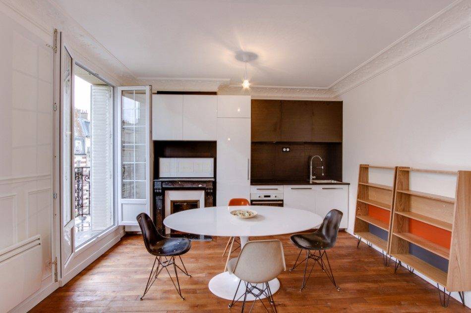Дополнительное пространство балкона станет отличным местом для холодильника, а перегородка в виде стола или барной стойки прекрасно заменит объёмный обеденный стол и освободит пространство для уютного небольшого диванчика.