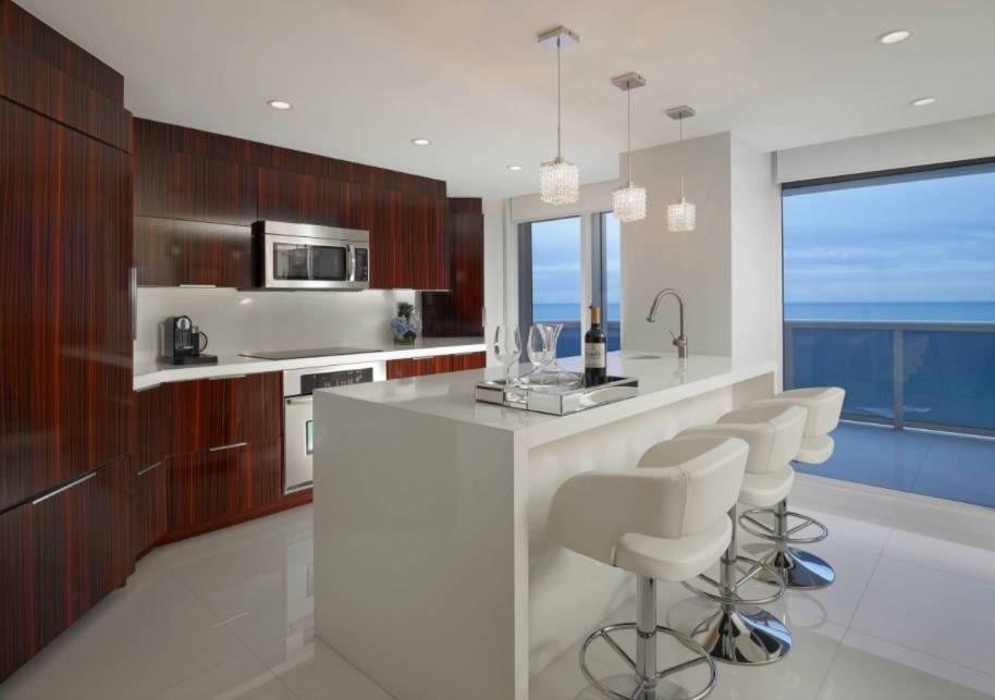 Особое внимание в планировке подобной комнаты следует уделить выбору мебели и всевозможные угловые конструкции здесь совсем не наш вариант. А вот различные дополнения фасадов стеклянными или пластиковыми деталями позволят кухне «дышать» и расширят весь интерьер