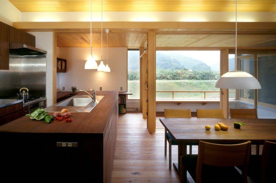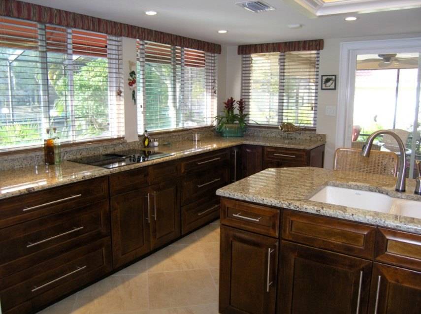 - В качестве напольного покрытия в рабочей зоне лучше отдать предпочтение кафельной плитке, керамограниту. В обеденной или зоне отдыха лучше использовать ламинат или линолеум.