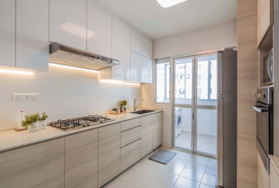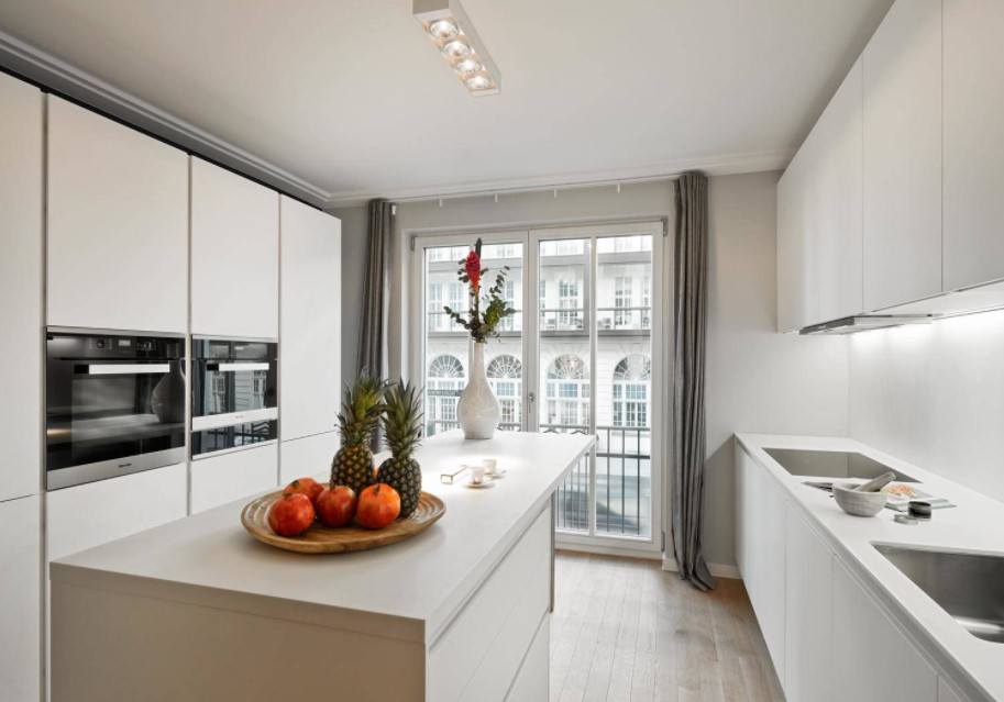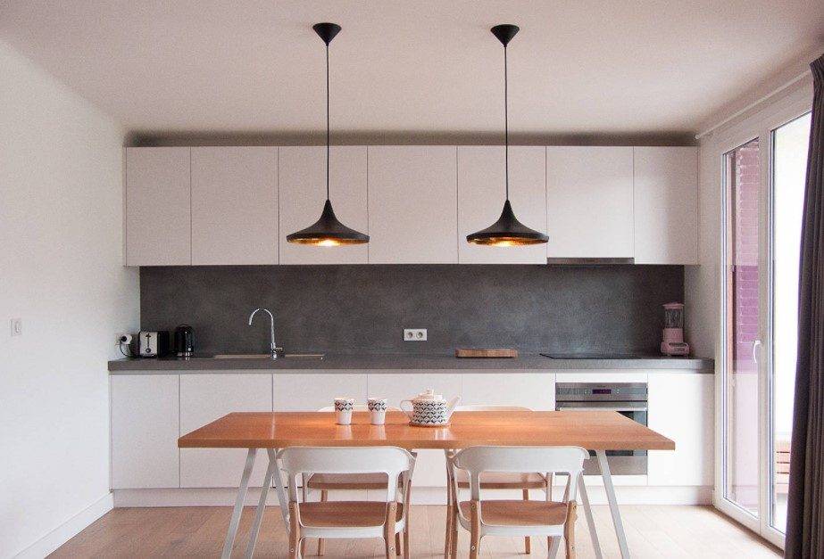 Теоретически, даже кухонный гарнитур с электроплитой, раковиной и вытяжкой можно установить на балконе. Но на такую перепланировку согласование могут получить только жильцы первых этажей. При выносе кухни на балкон необходимо перенести коммуникации, поэтому рабочая зона располагается на той же стороне, где до ремонта стояла раковина и вся техника.