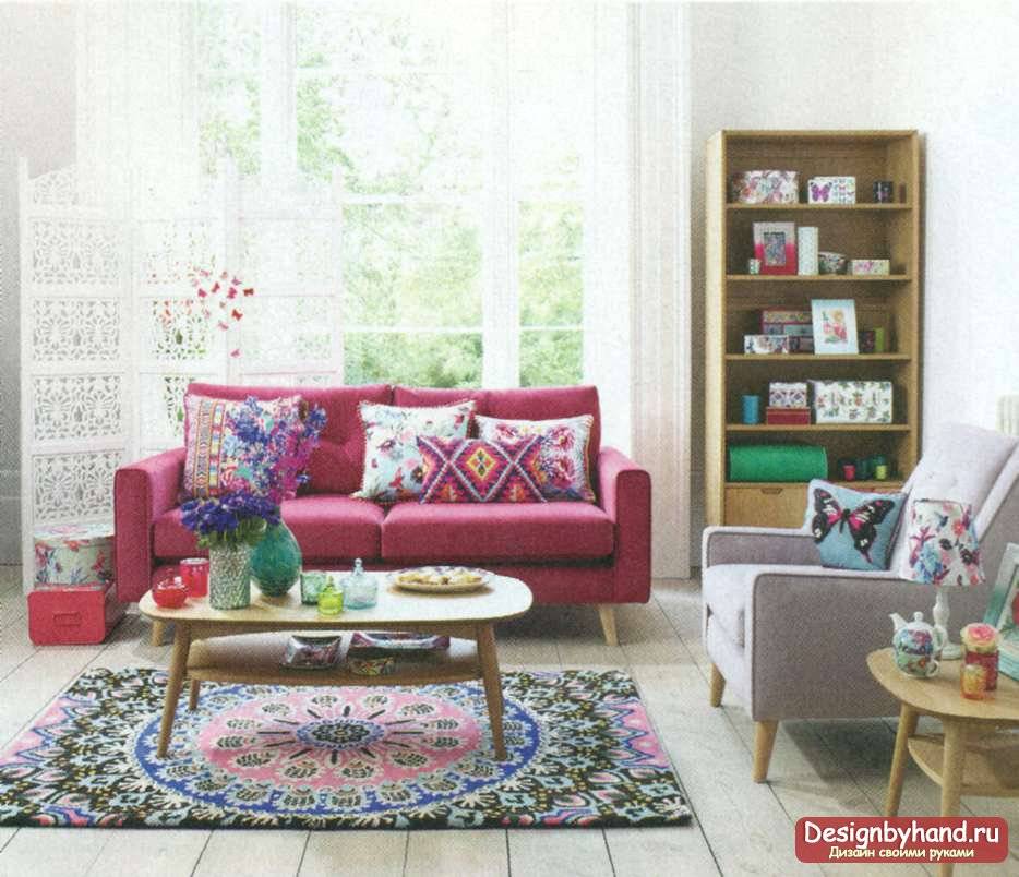 Фактурные ткани с аутентичными орнаментами и современными принтами подружились в этом интерьере с простой деревянной мебелью в скандинавском духе. Центр композиции гостиной – малиновый диван и черный ковер с узорами. На полу из простых окрашенных светлых досок эти вещицы выглядят весьма нарядно. Ну а прозрачно-кружевная ширма и вовсе создает в комнате кокетливое настроение