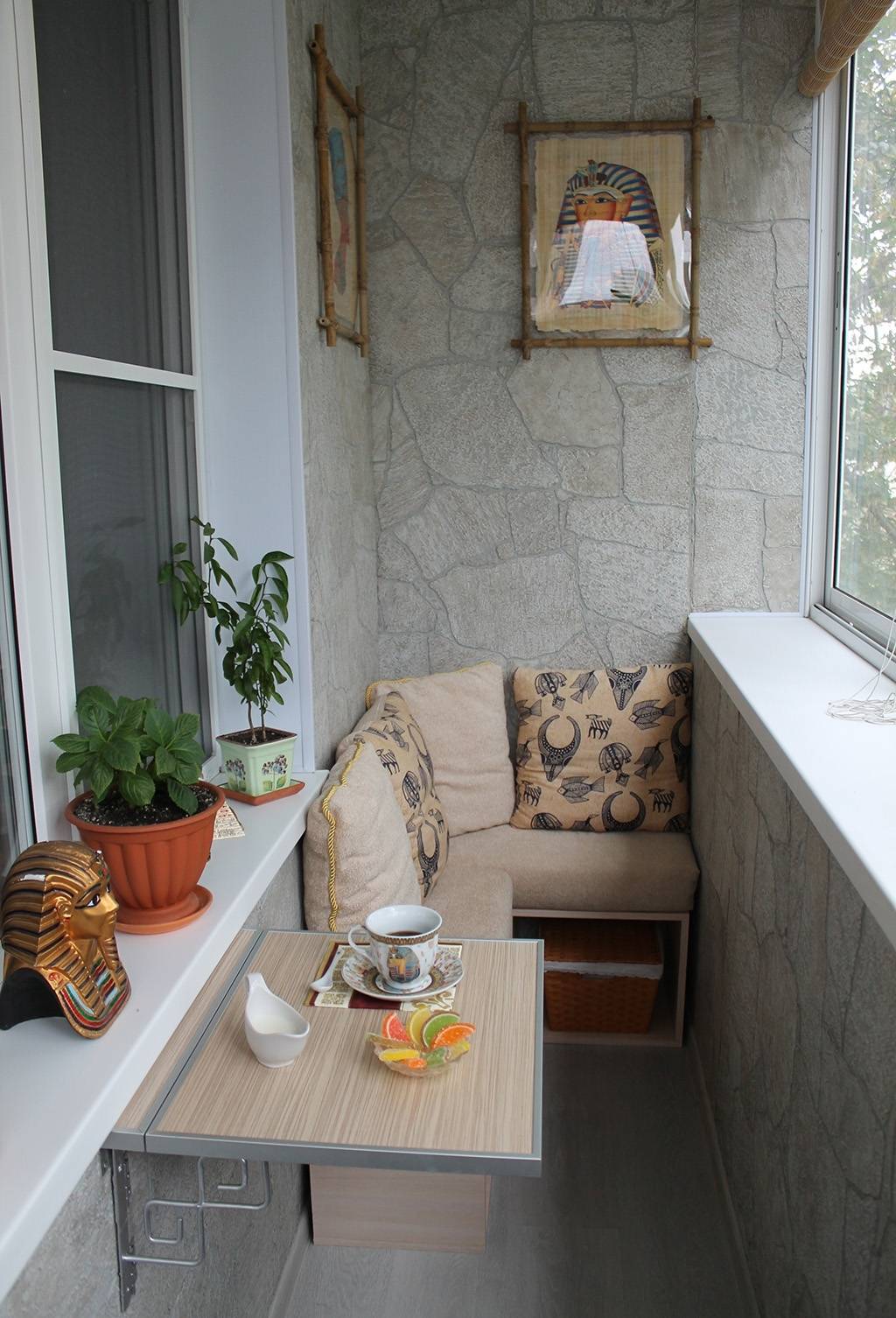 Конечно же, сюда подойдет раскладная. Она не займет много места, до воли практична и как раз для небольшой территории. Стол, стулья, пуфики — это все можно использовать на лоджии. Такие принадлежности могут быть, как встроенные так и выдвижные, в любой момент под рукой, удобно и комфортабельно.