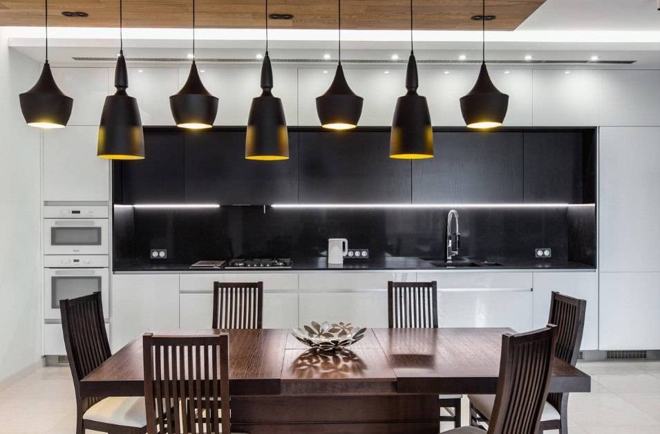Не смотря на все «против» в 2021 году, проектировщики продолжают совмещать между собой кухонную зону и гостиное пространство, одновременно разделяя их раздвижными панелями и оригинальными перегородками, которые чётко определяют границы. Такая реконструкция позволяют заниматься приготовлением еды, не прерывая общения с гостями или остальными членами семьи, что, по мнению психологов, делает общение более близким.