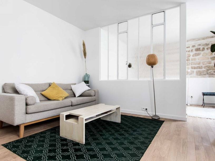 - Зонируйте с умом. Порой стеллажа, занавески или перегородки вполне достаточно, чтобы выделить функциональные зоны в квартире и сделать пространство «воздушнее» — массивных стен-то нету.
