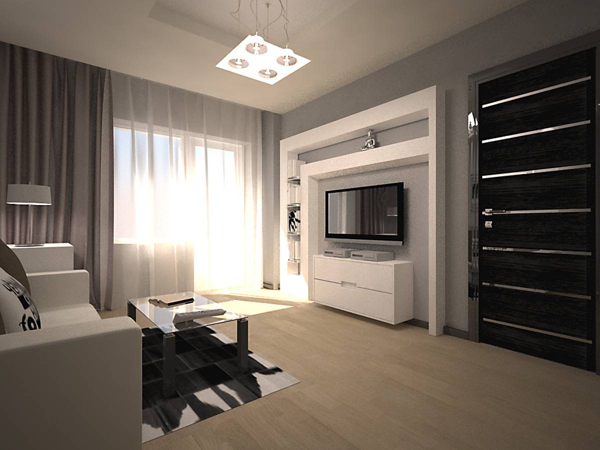 Дизайн квартиры в современном стиле спроектирован для молодой семейной пары. На небольшой площади удалось найти место для кухни-гостиной и уютной спальни. При перепланировке малогабаритной двухкомнатной квартиры увеличили ванную комнату, а в прихожей разместили компактную гардеробную. На том месте, где прежде была кухня, разместили спальню.