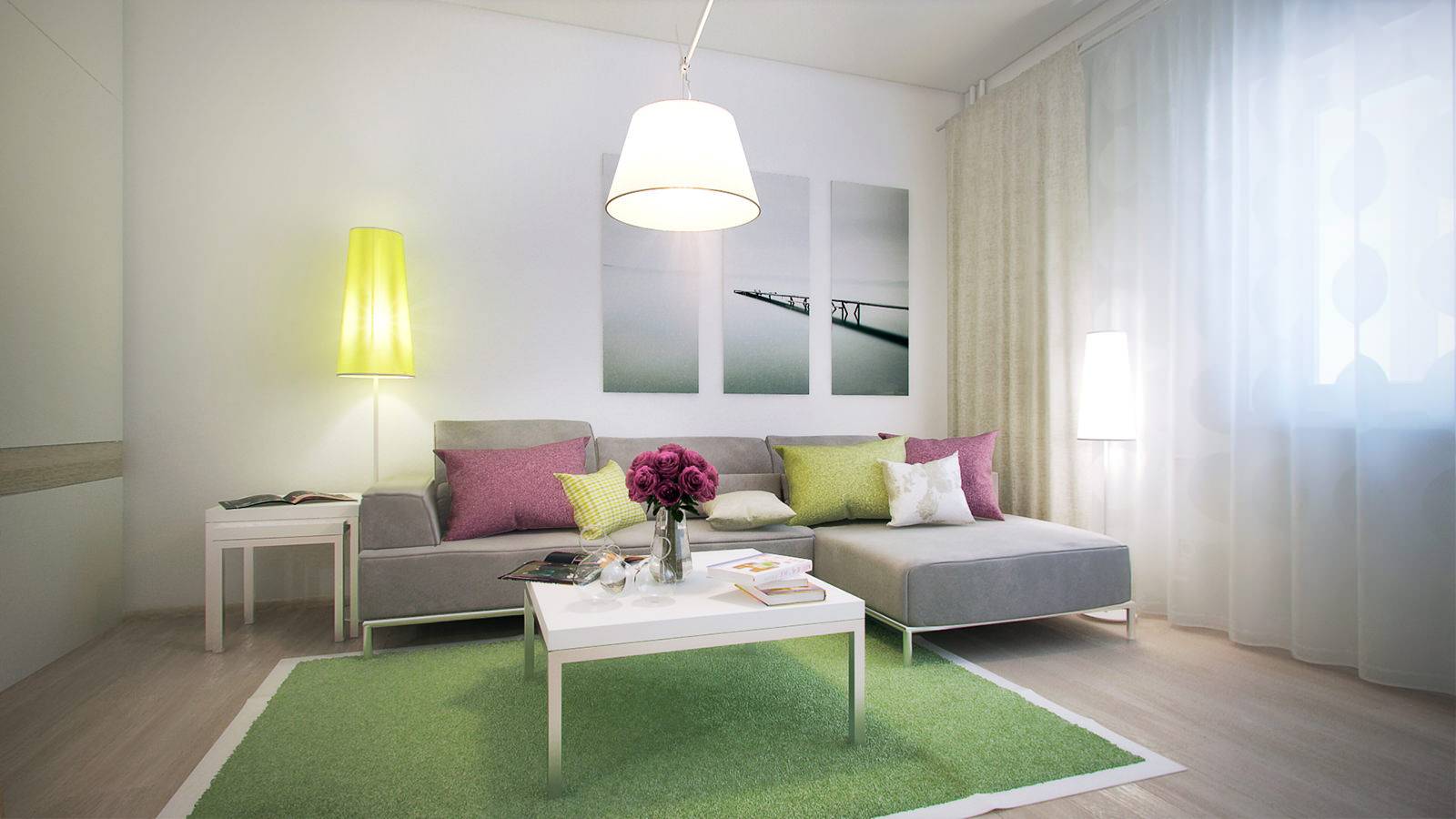 В ограниченном пространстве не стоит использовать много цветов, в особенности слишком яркие. За основу берутся светлые пастельные оттенки. Такие цвета, как красный, желтый, зеленый или фиолетовый могут выступать в качестве яркого пятна.