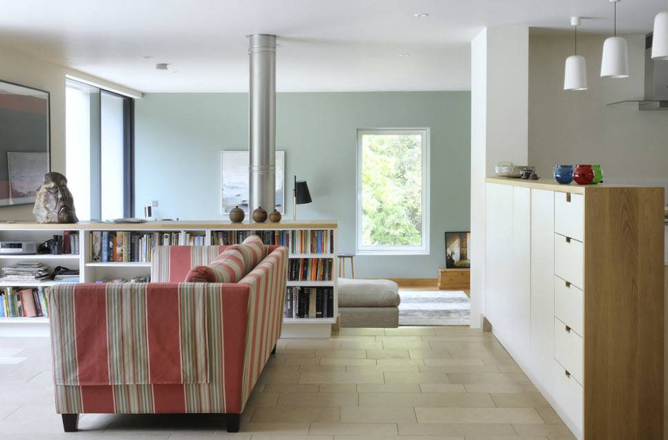 Деревянная “кирпичная” стена выступает в качестве декоративной границы между кухней и комнатой, обеспечивая высокий уровень оригинальности. Стены белого цвета и тем самым обеспечивают хорошую базу для вывешивания украшений. Красивые цветовые контрасты достигаются с помощью серого дивана и пола.