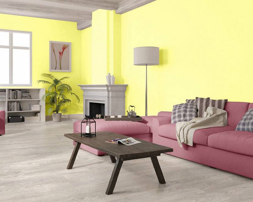 - Желтый – к светло-серому полу подойдёт бледный и розово-желтые оттенки. С насыщенными (ярко-желтые, оранжевые) тонами используются исключительно тёмные напольные покрытия.